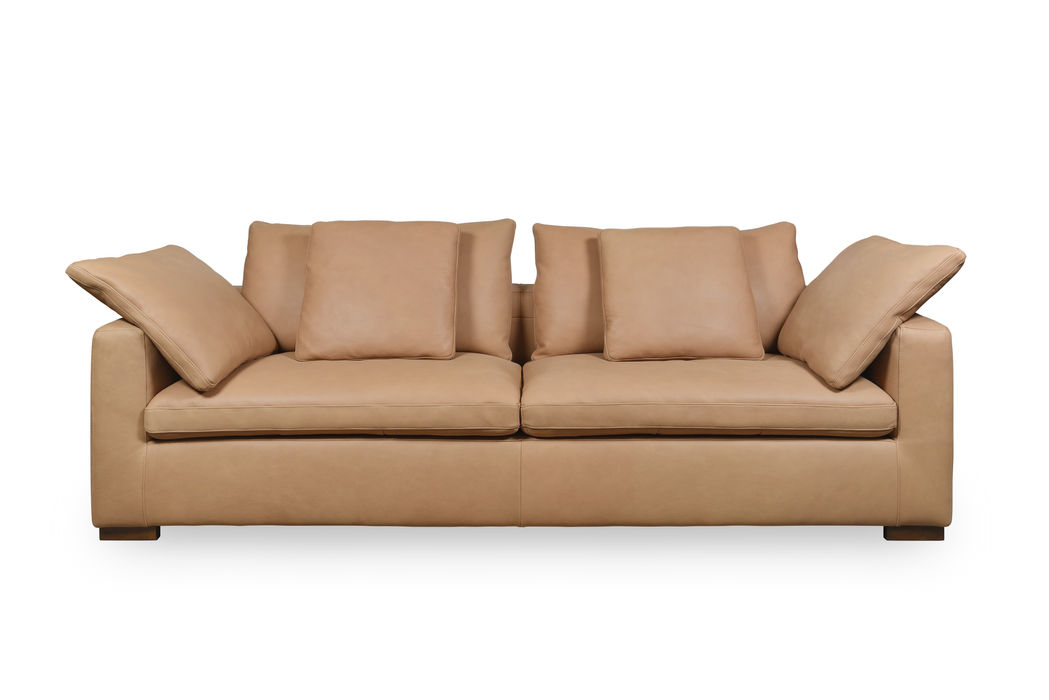 The 9346 sofa brings casual elegance with its plush cushions and low, structured frame. Its muted terracotta leather softens the space, while the surrounding neutral tones and boucle textures keep the overall palette airy and relaxed.